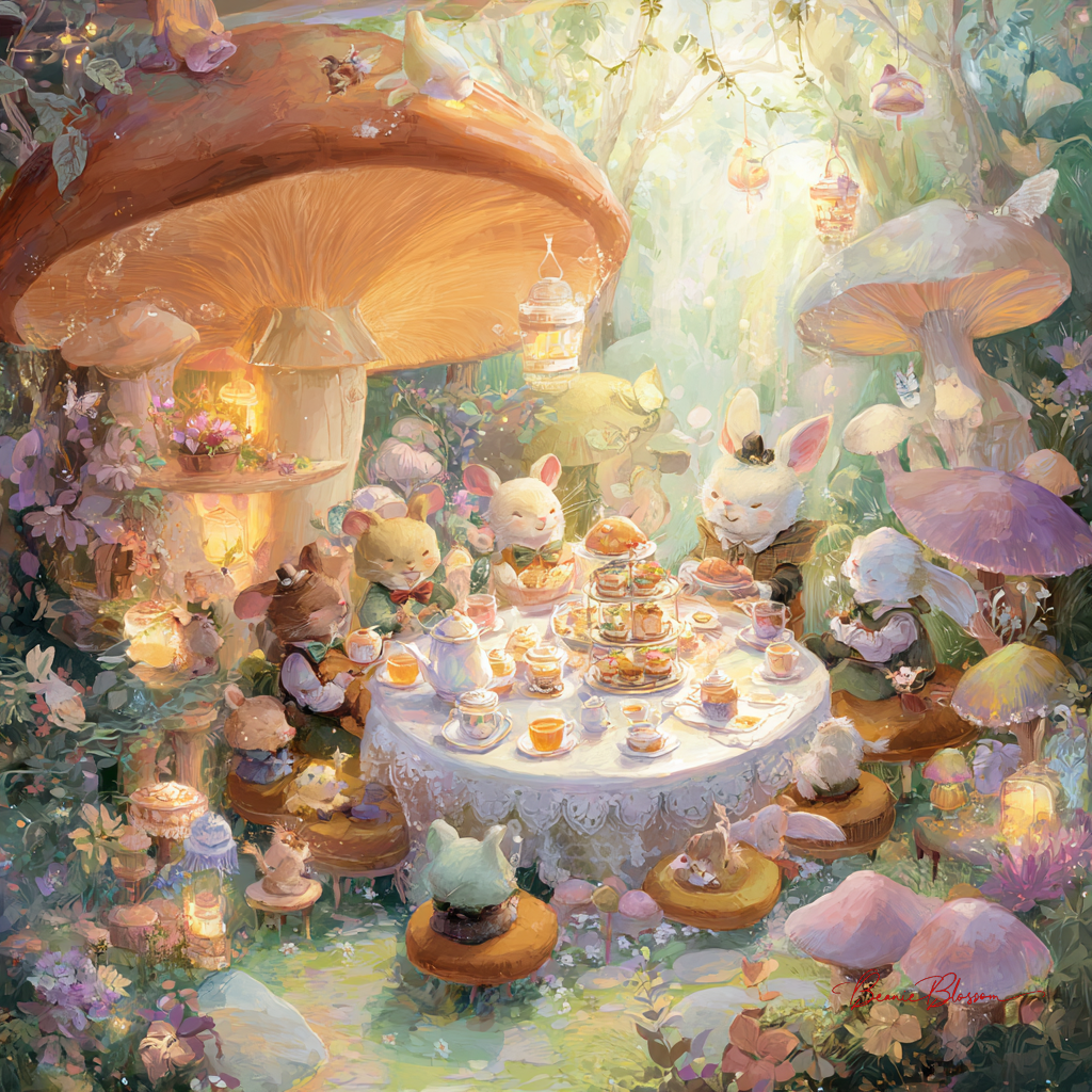 A whimsical pastel chalk illustration of an elaborate tea party taking place inside a giant mushroom house, with anthropomorphic woodland creatures wearing tiny spectacles and bow ties seated around a acorn-cap table, delicate porcelain thimbles serving as teacups filled with golden honey, miniature frosted cakes decorated with crystallized dewdrops and violet petals, soft dappled sunlight filtering through translucent mushroom walls casting rainbow prisms, tiny lanterns made from fireflies gently glowing in glass acorn shells, embroidered moss cushions and spider-silk doilies completing the enchanted domestic scene