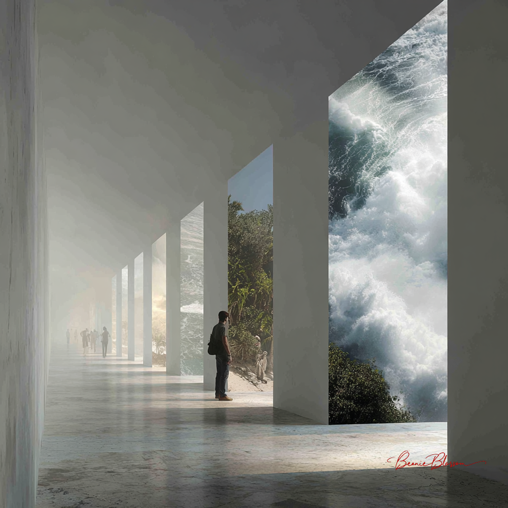 A long hallway where sections of the wall are replaced with perfectly cut openings showing entirely different environments behind them ocean waves, desert sand, forest greenery, or cloudy skies each contained within clean geometric frames. People walk through the hallway, occasionally pausing near the openings as light and atmosphere from each scene spill slightly into the space. The composition plays with contrast between controlled architecture and diverse natural elements. Rendered in clean semi-realistic style with sharp lines, balanced composition, and clear visual separation between spaces.