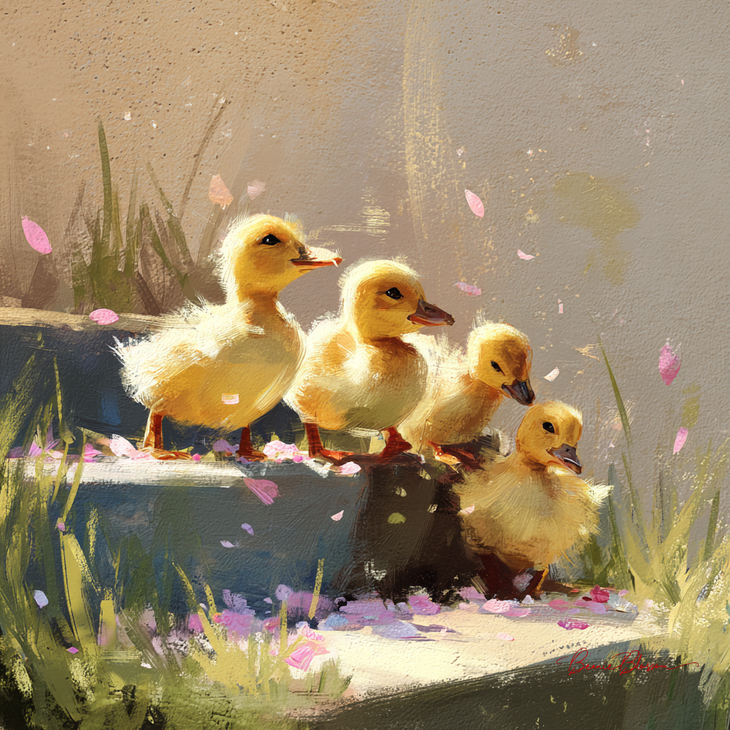 A small group of ducklings trying to climb a low garden step, each taking turns while one finally makes it and looks back as if encouraging the others. The scene feels lively and a little clumsy, with soft grass, scattered petals, and gentle spring light adding warmth. Rendered in soft painterly style with fresh colors, light textures, and a sweet, uplifting mood.