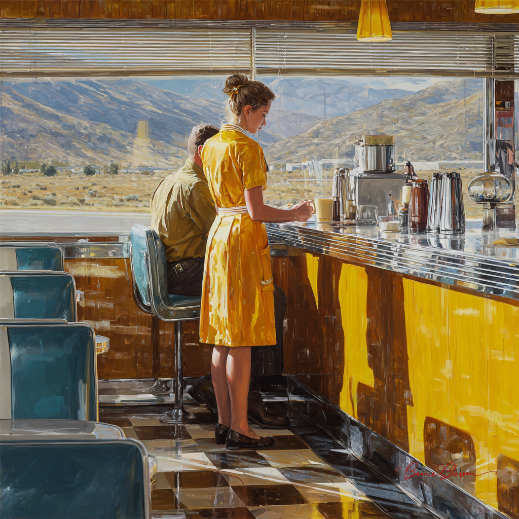 A sun-bleached 1970s roadside diner frozen in an eternal golden afternoon, rendered in the style of photorealistic American regionalist painting. A lone waitress in a mustard-yellow uniform refills a coffee mug for a weather-worn trucker, their reflections caught in the chrome napkin dispenser on the formica counter. Dusty venetian blinds stripe the scene with amber light.