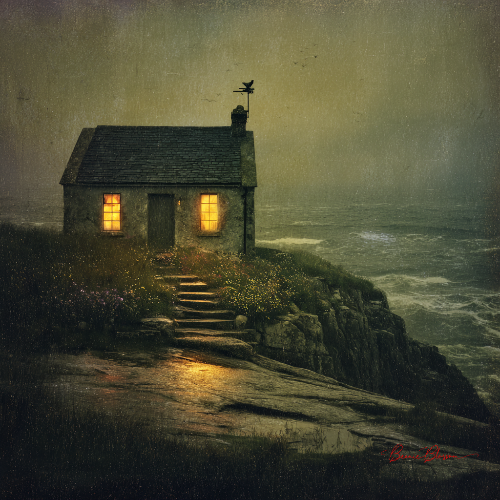 A dreamlike soft-focus photograph rendered in the style of a hand-tinted Edwardian postcard, depicting a solitary lighthouse keeper's cottage perched on a mossy Irish coastal cliff at the precise moment before a summer thunderstorm breaks. The cottage windows glow amber and honey-gold from within, casting warm pools of light across rain-slicked stone steps and wildflowers bent sideways by the incoming gale. The churning Atlantic below is a deep bruised violet and slate green, laced with white foam, while the sky above transitions from an eerie sulfur yellow at the horizon to deep charcoal purple at the zenith. A weathervane rooster atop the cottage tilts at a precarious angle. The overall palette is muted and painterly, with subtle grain texture and soft vignetting at the edges, evoking a feeling of cozy domestic fragility against vast elemental forces.
