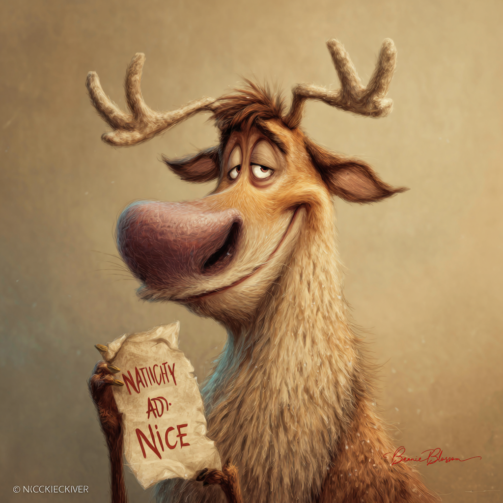 A portrait of a reindeer holding a slightly crumpled "Naughty and Nice" list in its hooves, one eyebrow raised with a knowing expression. The background is simple and softly lit, keeping the focus on the character’s face and gesture. Rendered in festive painterly style with warm browns, soft winter reds, gentle texture, and a subtle touch of holiday humor.