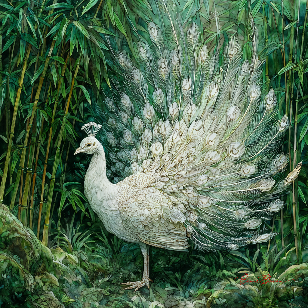 A hyper-detailed alcohol ink painting of a majestic albino peacock displaying its full plumage in a moonlit bamboo grove, each translucent feather eye catching ethereal silver light while delicate dewdrops cling to the surrounding jade-green stalks, the bird's neck arched gracefully as wisps of morning mist curl around its feet on the moss-covered ground