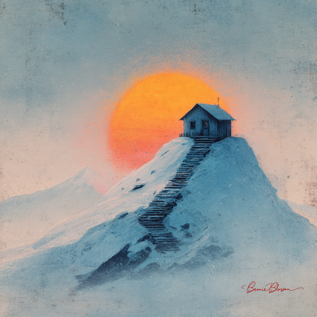 a small cabin on top of a snowy mountain, with stairs leading up to it. the sunrise is in the background, in the style of a realistic painting.