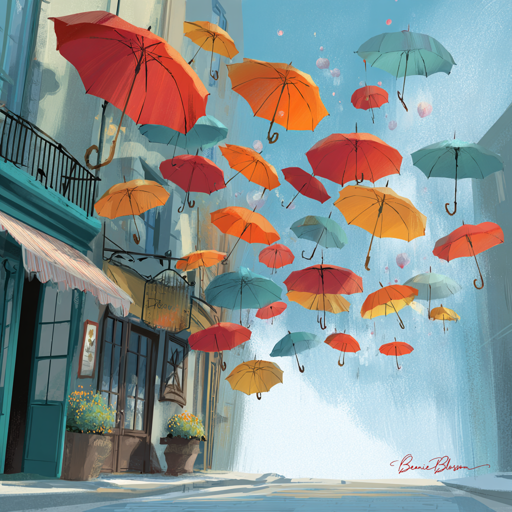 A line of umbrellas left outside a café suddenly lifts into the air, drifting upward like balloons, their handles dangling below. The street is empty, as if the umbrellas decided to escape on their own. Rendered in playful whimsical style with bright accents, light motion, and a sense of gentle mischief.