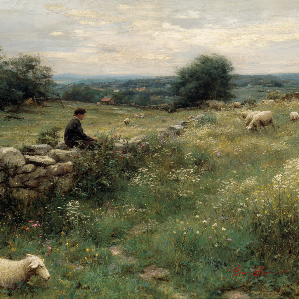 A quiet meadow at the edge of a village, where a shepherd sits on a low stone wall watching a small flock of sheep graze peacefully. Wildflowers sway in the breeze, and the sky is wide and pale. Rendered in soft painterly style with muted colors, loose brushstrokes, and a comforting, unhurried mood.
