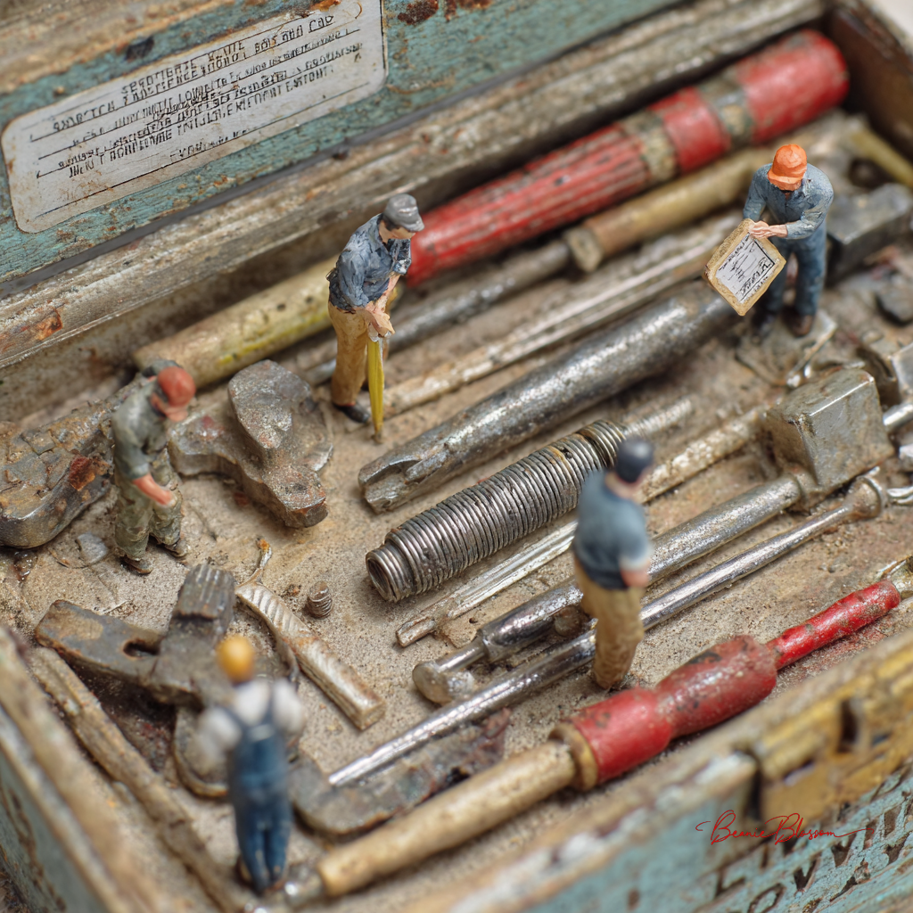 A close-up view of a well-used toolbox, each tool marked by years of wear scratches, chipped paint, and polished metal softened by use. Tiny miniature workmen are scattered among the tools: one sanding a worn handle, another inspecting a screw with a clipboard, a third carrying a coil of wire across the metal surface. A small handwritten label is taped inside the lid, barely legible. The scene feels intimate and quietly alive, focusing on texture, scale contrast, age, and subtle human presence. Rendered in detailed macro-style realism with shallow depth of field and natural light.