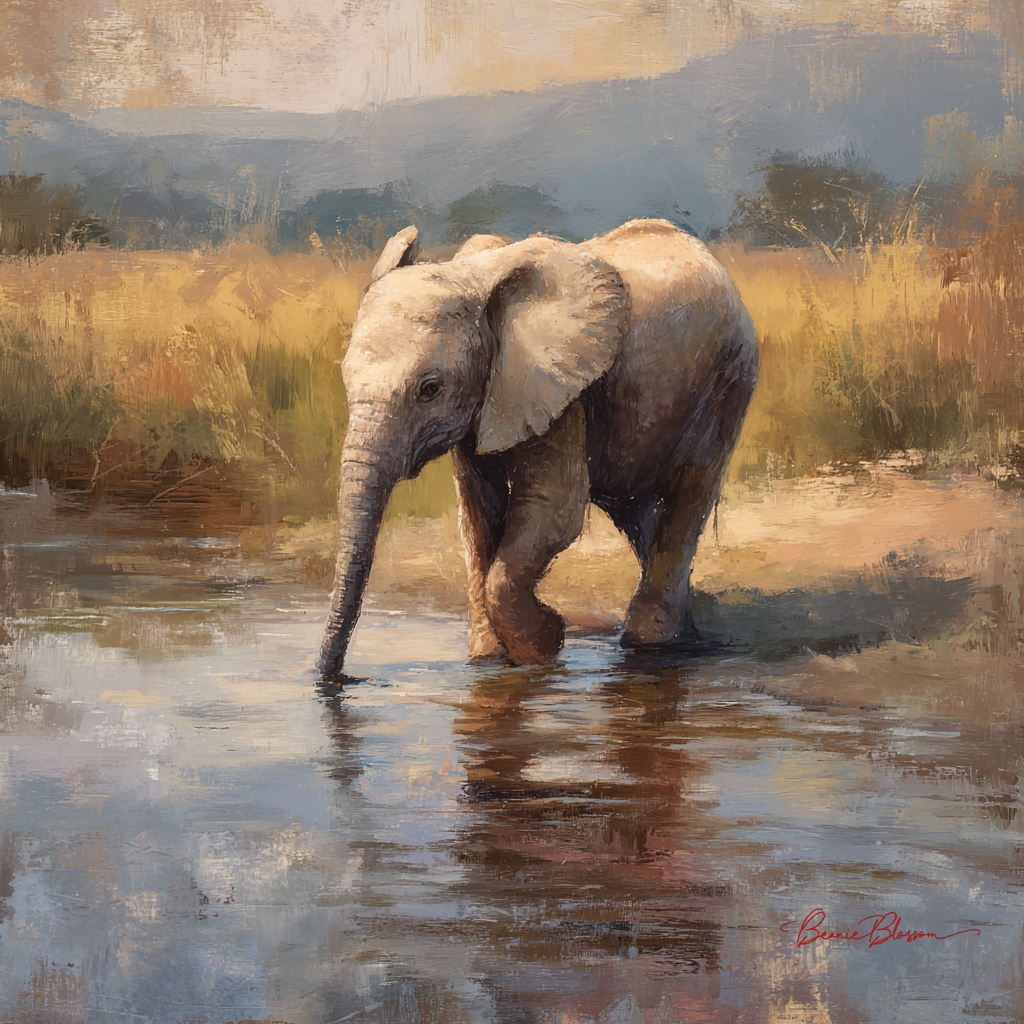 A young elephant stands at the edge of a shallow river, carefully testing the water with one foot before stepping in. The surrounding landscape is simple and open, letting the gesture take center stage. Rendered in soft painterly style with warm earth tones, loose brushwork, and a calm, tender mood.
