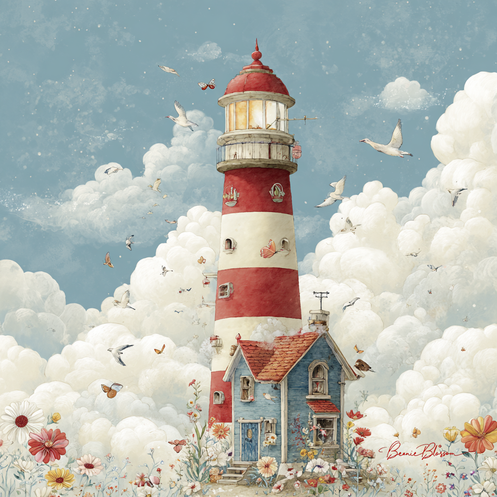 a whimsical lighthouse with red and white stripes, surrounded by fluffy clouds and seagulls flying overhead. the scene is rendered in soft pastel colors, creating an enchanting atmosphere reminiscent of children's book illustrations. a small house sits at the base of the light, choppy tower, adorned with playful characters such as flowers, butterflies, and birds.