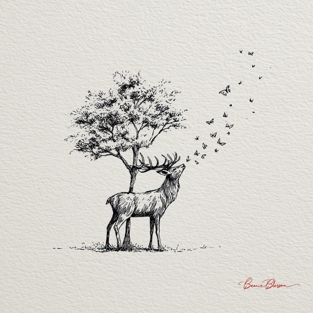 a simple ink drawing of a deer standing under a tree, blowing out butterflies from its mouth, against a white background, with simple lines.