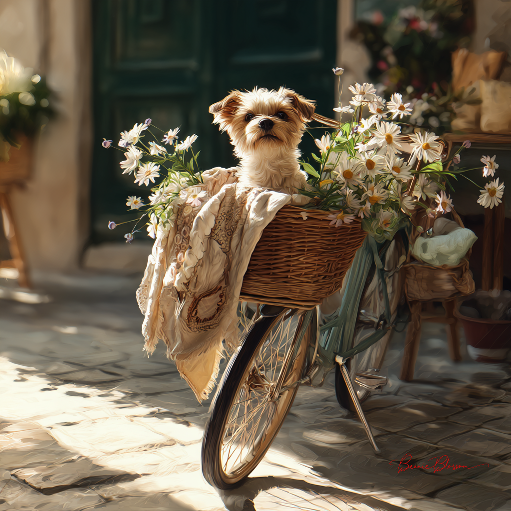 A small roadside flower stand on a sunny day, buckets filled with fresh blooms in different colors. A few people stop to choose flowers while petals and leaves are scattered gently across the ground. The scene feels simple, kind, and full of everyday joy. Rendered in soft painterly style with warm tones, smooth blending, and a light, uplifting atmosphere.