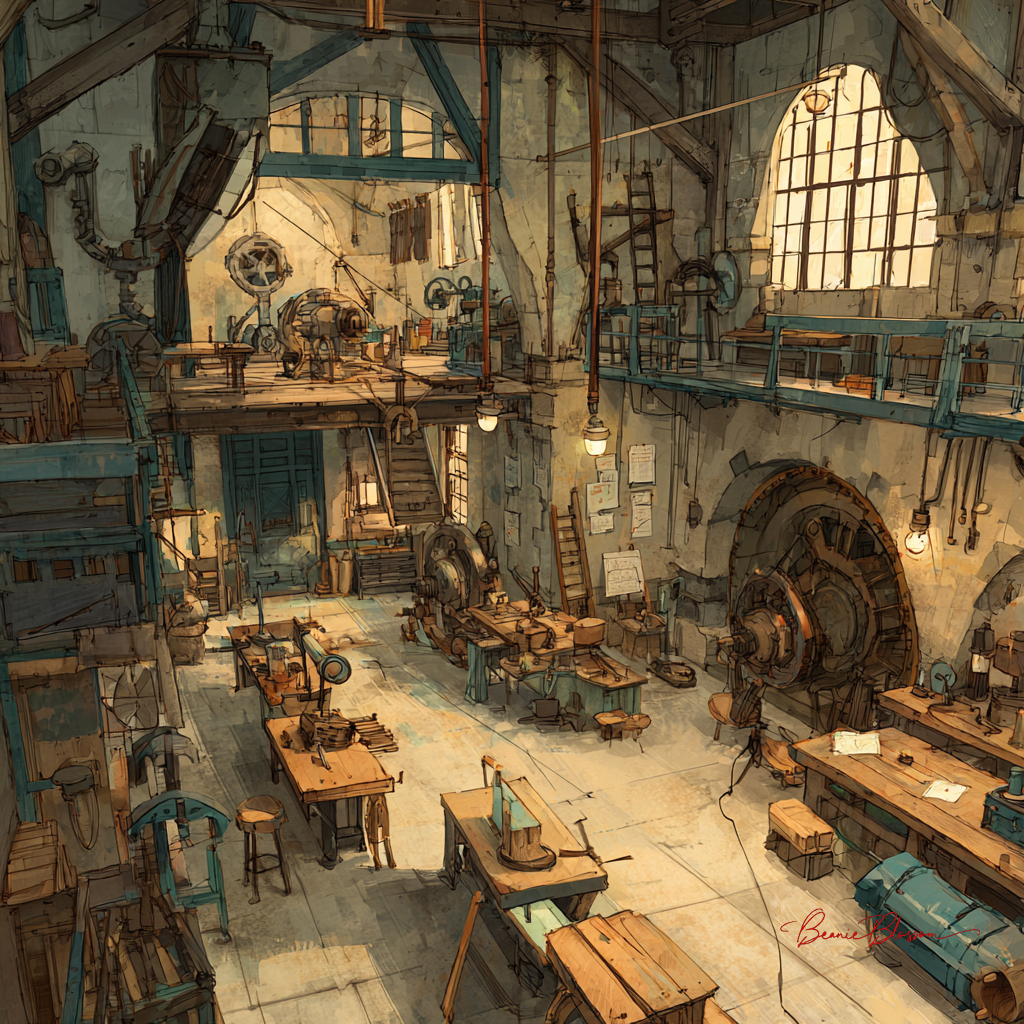 A large mechanical workshop filled with half-built contraptions gears, wheels, wooden frames, and strange inventions in different stages of assembly. Workbenches are cluttered with tools and sketches while light falls in from high windows, highlighting dust and metal surfaces. The scene feels active and full of invention. Rendered in expressive painterly style with warm industrial tones, layered detail, and rich atmosphere.