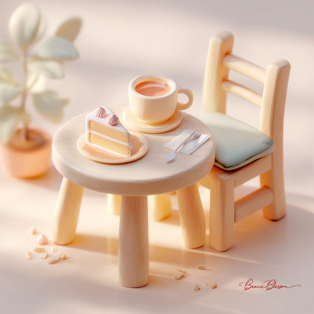 A tiny café table set for one, where a small slice of cake and a cup sit neatly arranged, but everything is slightly oversized compared to the chair suggesting a very small visitor. Soft crumbs, a folded napkin, and gentle morning light create a sweet, quiet moment. Rendered in soft 3D illustration style with smooth surfaces, pastel tones, gentle shadows, and a cozy, adorable feel.