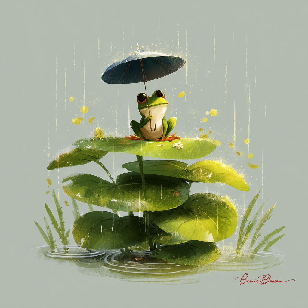 A small frog sitting on a stack of slightly oversized leaves like cushions, proudly holding a tiny umbrella above its head. Raindrops fall gently around it, creating soft ripples in nearby puddles while the frog stays perfectly dry. Rendered in charming stylized illustration style with soft textures, fresh greens, gentle lighting, and a playful, cozy mood.