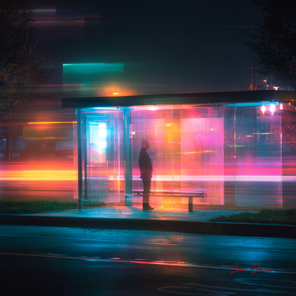 A person standing at a quiet urban bus stop at night, surrounded by glowing, translucent light trails and layered color fragments that stretch across the scene. The glass shelter reflects and refracts vibrant neon hues, with subtle motion blur and soft digital distortions creating a dreamlike atmosphere. The street feels calm and empty, illuminated by overlapping light streaks and shifting reflections. Cinematic lighting, rich contrast, smooth gradients, and a balance between realism and abstract color flow.