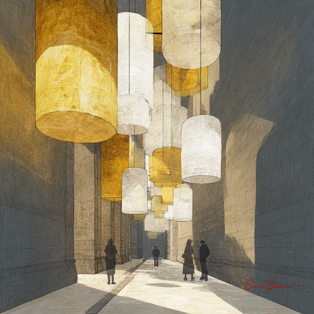A series of oversized paper lanterns drifting through a narrow city alley, each lantern made from different materials--translucent rice paper, frosted glass, thin fabric--casting layered patterns of light onto the walls and ground. A few people walk through the scene, partially illuminated and partially obscured by overlapping shadows. The composition plays with repetition, depth, and rhythm, with clean architectural lines contrasting soft glowing forms. Rendered in a modern graphic-leaning style with controlled color palette, crisp edges, and subtle texture variation.