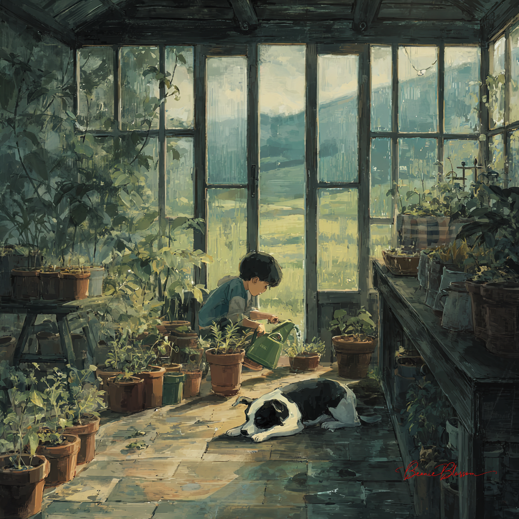 cozy countryside greenhouse filled with slightly overgrown plants, where a child carefully waters a row of mismatched pots while a sleepy old dog rests nearby in a patch of sunlight. Condensation gathers on the glass panes, blurring the view of rolling hills and a distant cottage outside. Light filters in softly, creating warm highlights and gentle shadows across leaves and worn wooden surfaces. Rendered in a painterly style with soft brushwork, rich natural colors, and a calm, comforting atmosphere.