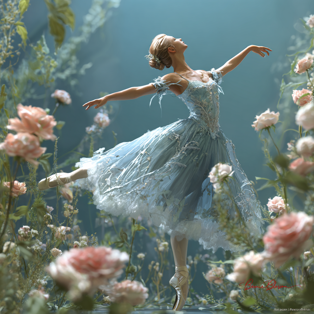 a girl in an elegant blue dress dances ballet, surrounded by flowers and plants, a full-body portrait, a 3d rendering, in high definition, high resolution, high detail, of the best quality, with a detailed skin texture, and high levels of detail.