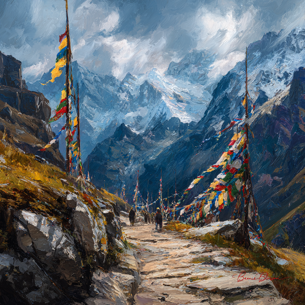 A winding mountain pass filled with colorful prayer flags stretching between weathered stone pillars, fluttering in strong alpine wind. Travelers move along a narrow path below while clouds roll through the valley, revealing distant snow-covered peaks. Rendered in expressive painterly style with rich color transitions, atmospheric depth, and dynamic movement in fabric and sky.