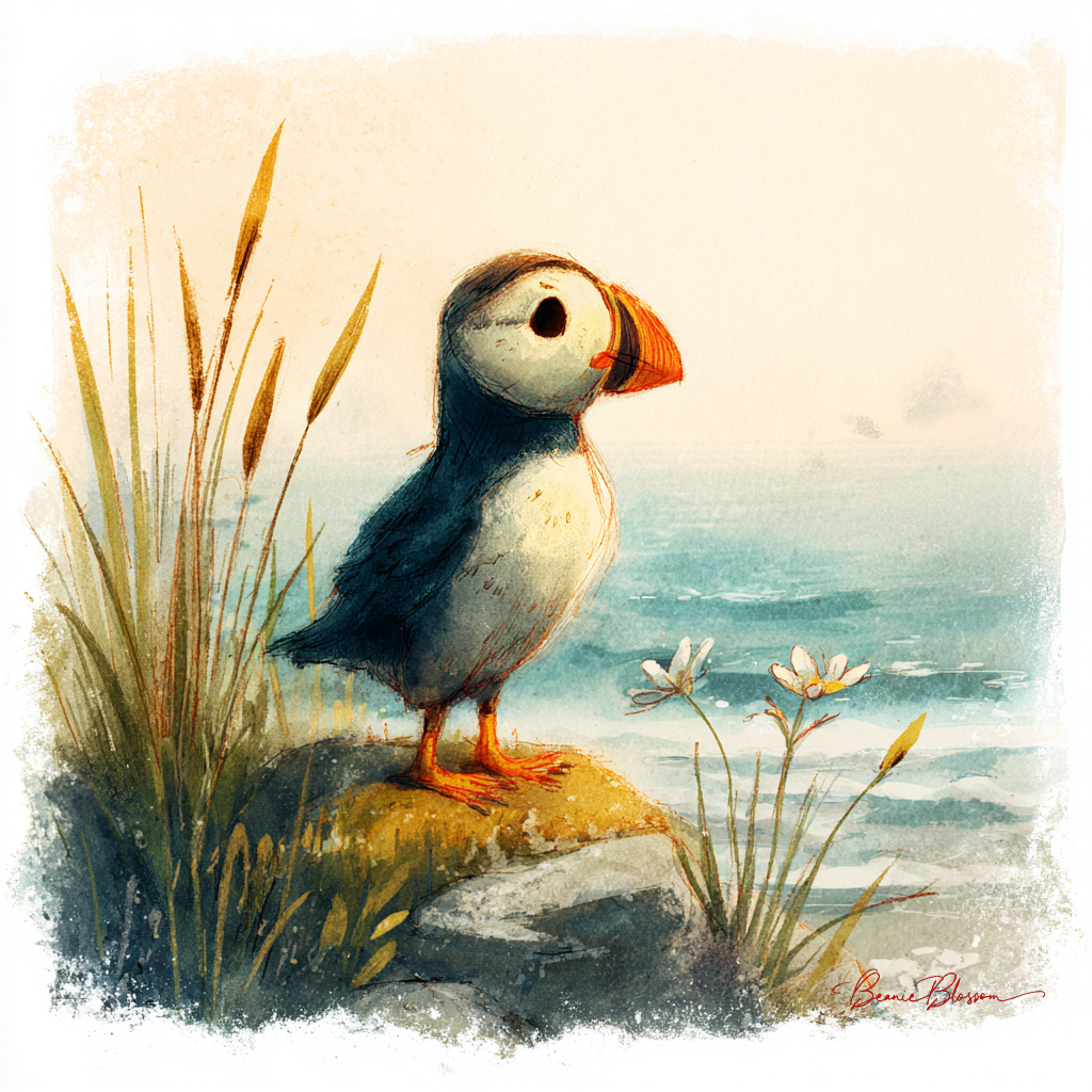 A tiny puffin standing on a mossy seaside rock. Its round body, bright orange feet, and curious tilted head make it irresistibly adorable while gentle ocean waves roll behind it. Soft coastal flowers and grasses sway nearby in the breeze. Rendered in charming storybook illustration style with soft watercolor textures, warm colors, delicate outlines, and a wholesome, heart-melting atmosphere.