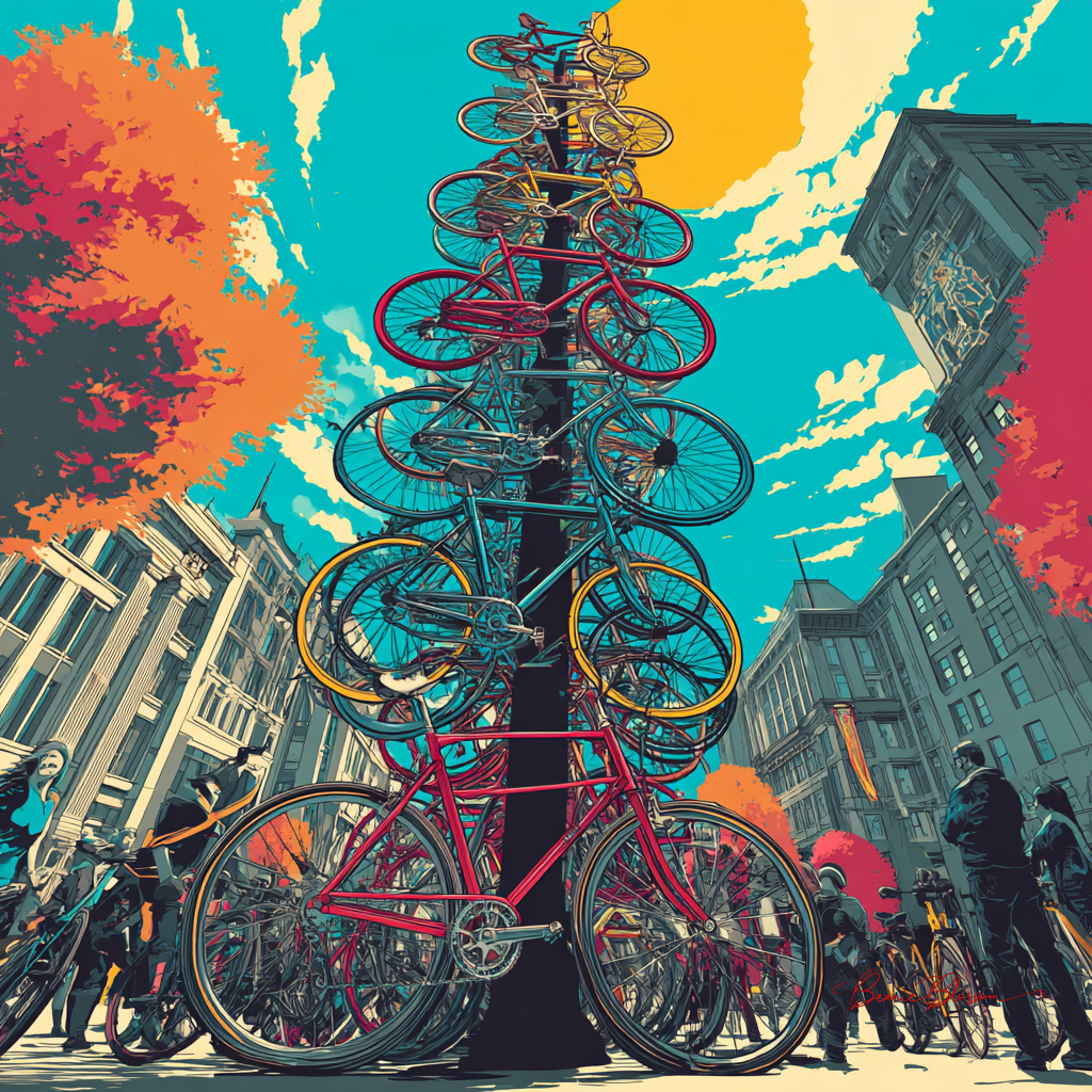 A tall stack of brightly colored bicycles is carefully balanced in the middle of a city plaza, forming a strange tower that reaches several stories high. Some bicycles hang sideways, others upside down, while people gather around looking up and taking photos. Sunlight reflects off metal frames and spinning wheels. Rendered in vibrant stylized style with strong colors, layered composition, and lively urban atmosphere.